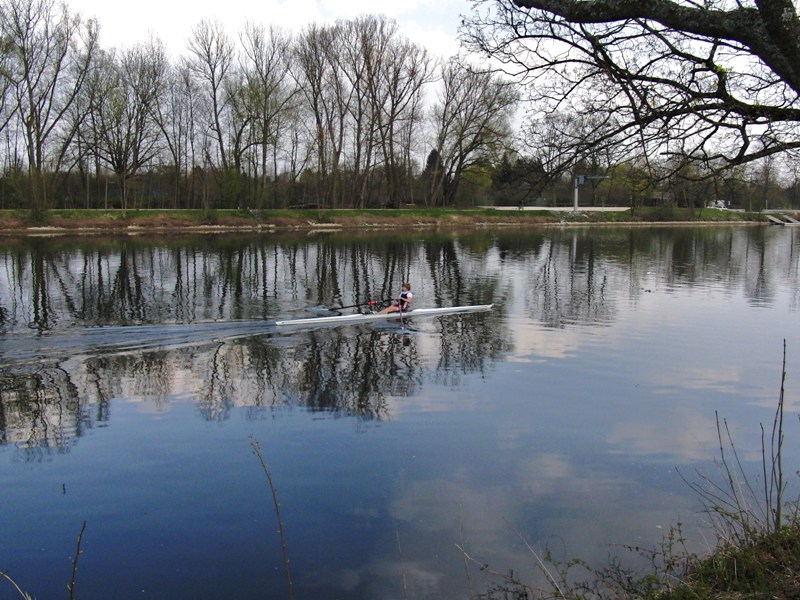Zij kwamen roeiers tegen die door een coach in een volgboot werden geïnstrueerd.