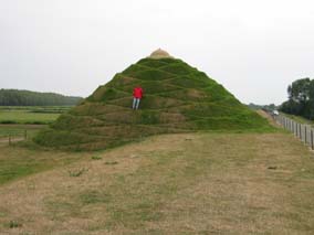 Onderweg kwamen zij schapen tegen in de wei langs het pad. Ze passeerden ook de dijkdoorbraak monumentenheuvel hieronder.