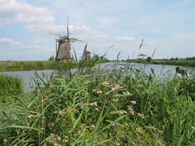 Natuurlijk volgt hier een foto van de molens op een rij tussen het riet.