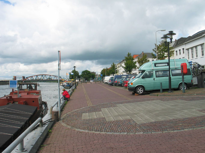 Na het ontbijt reden wij van zijn huis via de secundaire wegen door de Veluwe. Na een half uur begon het te regenen en volgens het weerbericht zou het verder in het land beter weer zijn. Daarom reden wij verder over de Yssel tot aan Zutphen. Over de oude Ysselbrug met een doorrijhoogte van 2,80 m kwamen wij op de parkeerplaats aan de kade aan de Oostoever van de Yssel.
