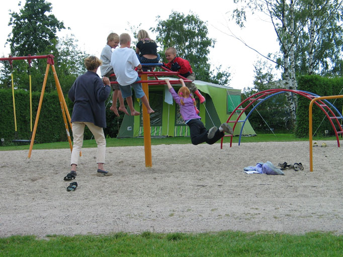 Wij kregen plaats nr 14 of 21 toegewezen in de bomengroep. Maar bij aankomst bleek alleen nr 21 nog over. Maar na een poosje zagen wij dat de camper op nr 14 weg ging zodat wij naar die plek gingen. Die was recht tegenover de speelplaats. Renzo ging meteen de schommel uitproberen en hij kon het al heel goed. Maar er waren natuurlijk grotere jongens die het nog beter konden en van hen leerde hij hoe je heel hoog kon schommelen en dan vanaf het hoogste punt er vanaf kon springen.