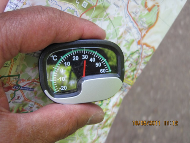 Die kwam uit boven op een heuvelrug boven Auxerre bij een provinciale weg maar daar hield het pad op. Ondertussen liep de temperatuur al behoorlijk op.