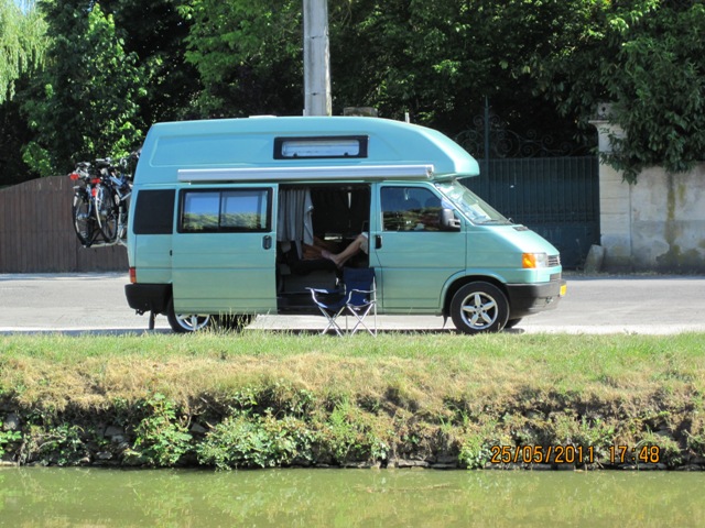 Bij St. Amand konden wij langs het kanaal staan in de brandende zon. Aan de overkant konden auto's parkeren.