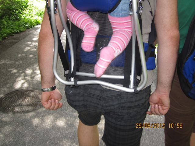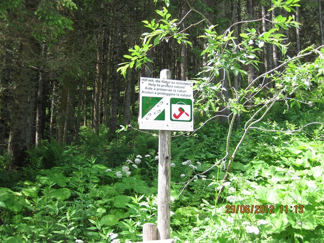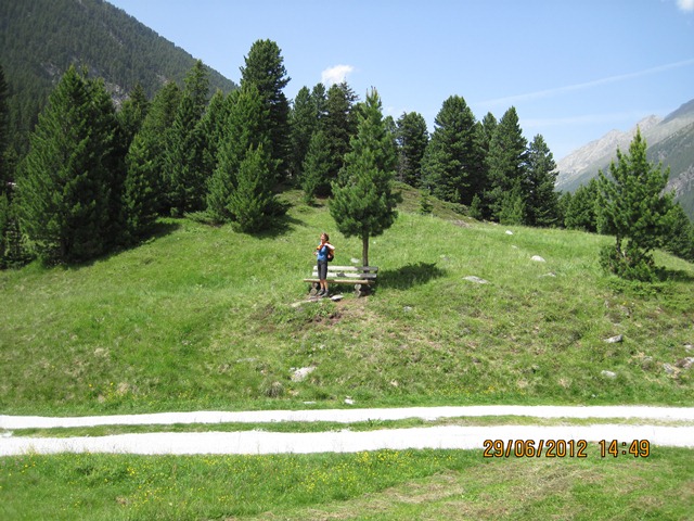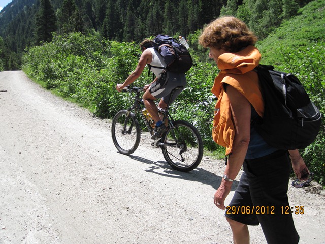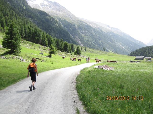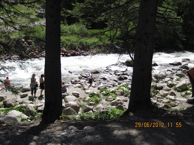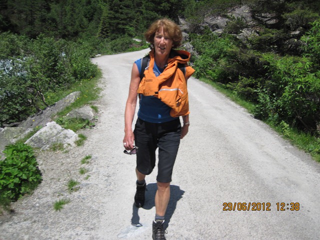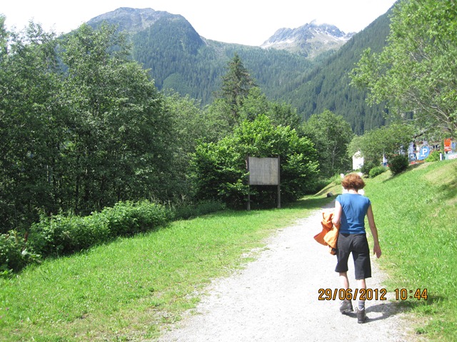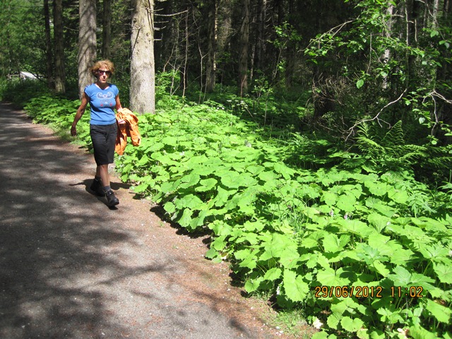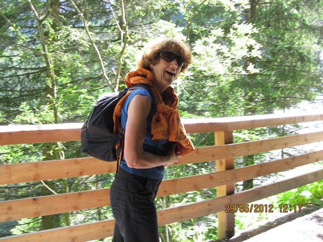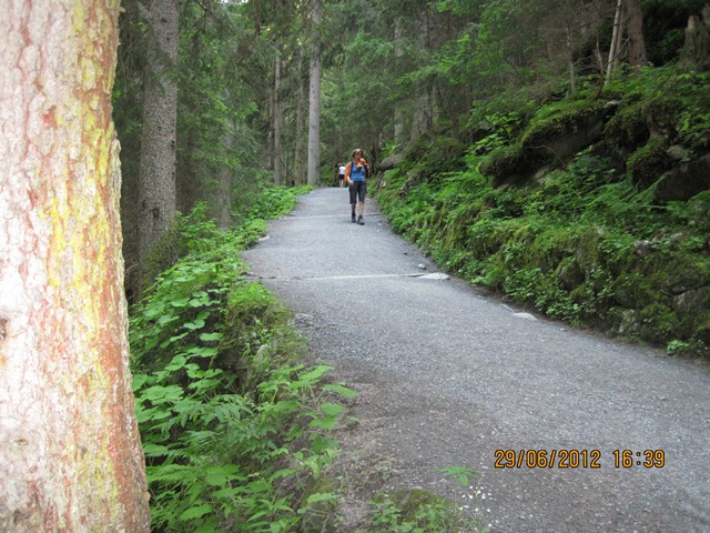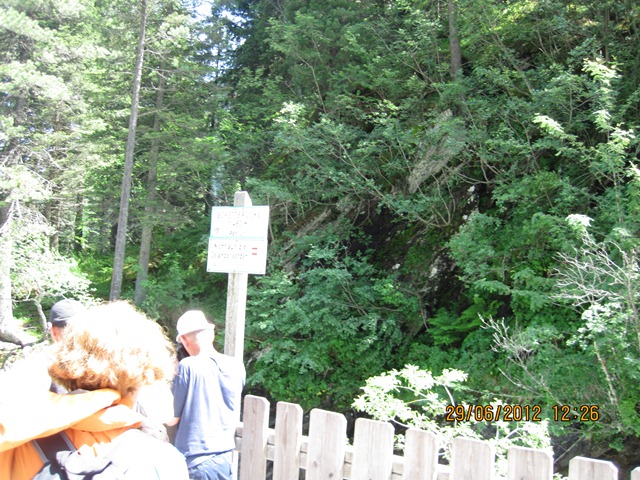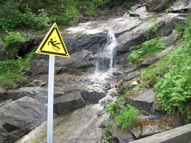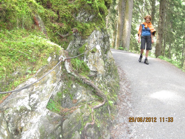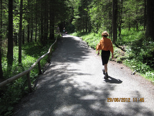 Na het ontbijt trokken Ton en toos hun stoute bergschoenen aan en ginen zij de weg oversteken. Zij liepen het pad parallel aan de weg richting de watervallen.