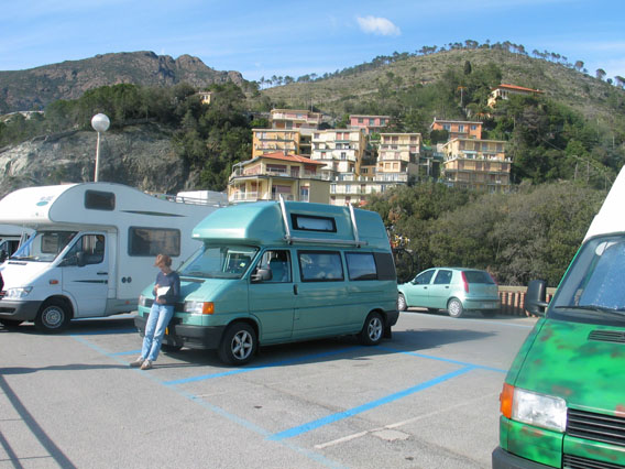 In het boekje stond dat bij Bartelomeo een camperplaats was. Ton stopte dus bij een pompstation in de stad en ging naar de Officina del Turismo aan de overkant. Hij vroeg aan de jongeman in het Engels waar de camperplaats was. Hij kreeg een kaart en een aanduiding waar de camperplaats was. Gelukkig niet ver er vandaan, eerste straat links tweede straat rechts. Daar zagen wij een omheind terrein met drie rijen van vijftien campers onder een paar platanen. Wij gingen het eerste pad in en kwamen aan het eind bij een servicepunt. Die moest natuurlijk vrijgehouden worden en ook de waterkraan. Ton maneuvreerde mij zodanig langs een paal en een boom dat iedereen er wel langs kon dacht hij maar na een uur kwam er weer een college camper en die wilde er ook nog naast staan. Ton maneuvreerde mij toen aan de andere kant van de paal dan kon de andere camper langs de boom en de paal staan.