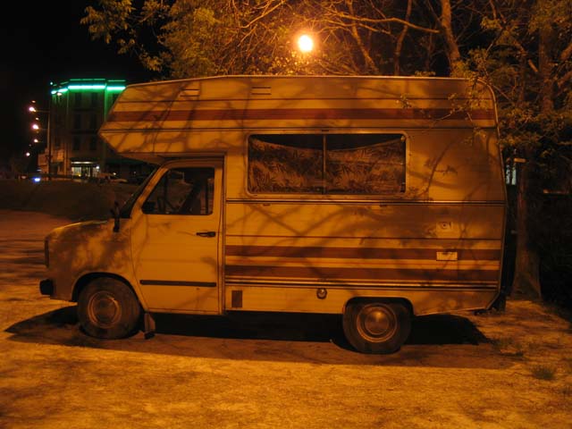 de boulevard af maar daar verder waren geen geschikte plaatsen dus gingen we toch naast de oude verlaten camper staan.
