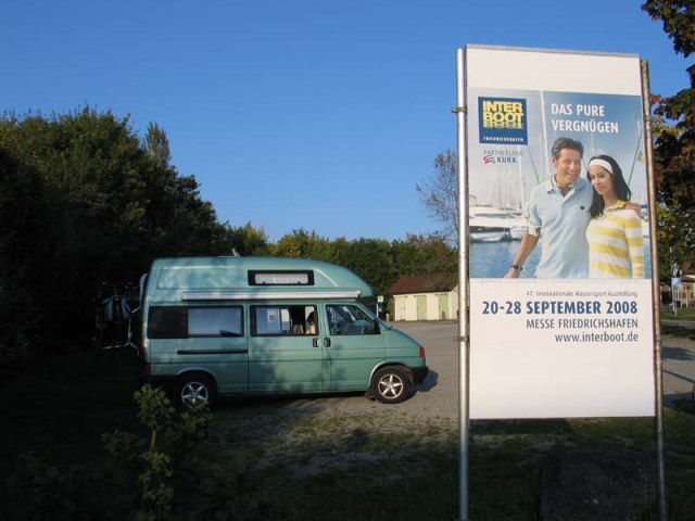 We gingen op de eerste staan op de uiterste plaats het dichtst bij de rotonde. Er werd daar reclame gemaakt voor de botententoonstelling in Friedrichshaven.