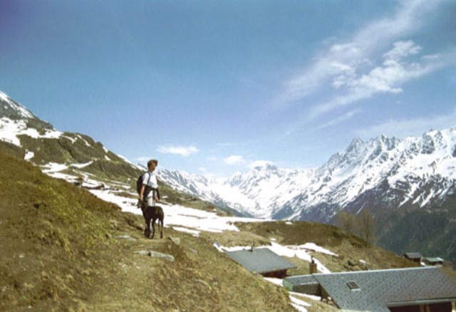 We bogen af naar rechts en kwamen langs een steil stuk van de helling waar het pad langs liep. Het pad werd op de kaart aangeduid als het gemzenpad. Net toen mijn baas het tegen mijn bazin zei dat wij over het gemzenpad liepen rook ik een wild dier. Mijn baas had uit voorzorg mij aan de lijn gehouden. Ik trok aan de lijn en wilde de helling af gaan want ik zag in de verte een soort geit. Het is een gems zei mijn baas en dat kun je wel verwachten als je over het gemzenpad loopt.