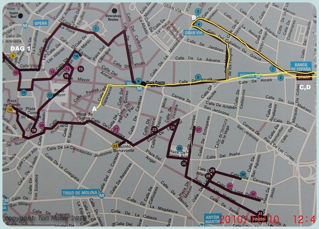 De eerste wandeling (geel) van 3 km via SOL en de Banco d'Espagna naar Puerto del Alcalá VV