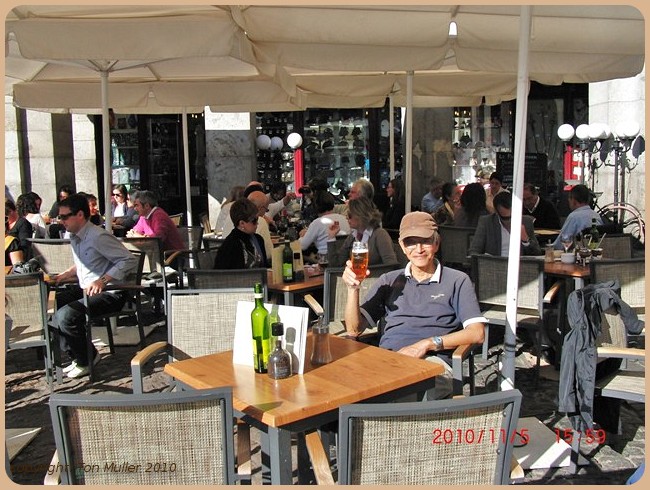 In de middag twee pilsjes en een wijntje gedronken op de Plaza Mayor. Naast twee tafeltjes met Nederlanders.