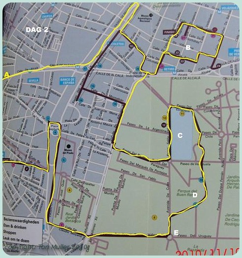 De tweede wandeling (geel) van 6 km via SOL en de Banco d'Espagna naar Puerto del Alcalá en de shopping malls en het park VV