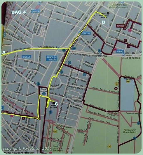 Na terugkomst in het hotel gingen wij daarna eerst naar het Bibliotheek museum (B), via de Banco d 'Espagna waar wij de bus die wij dinsdagochtend