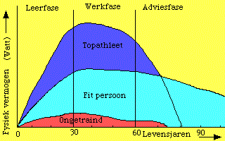 In de figuur is ook te zien dat je je fysieke top bereikt rond je dertigste, sommigen wat eerder en dat je daarna