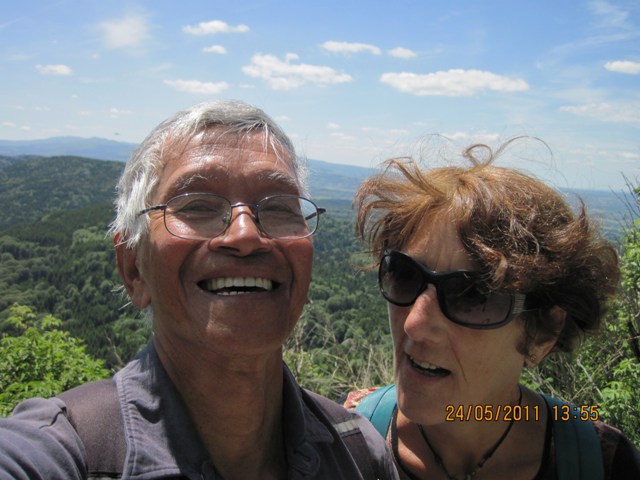 Ton en Toos liepen door tot boven de boomgrens en zochten vlak voor de top een bankje op en genoten van het uitzicht.