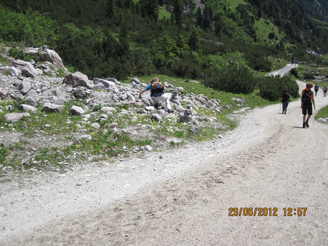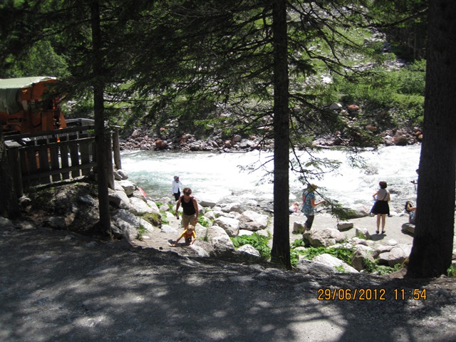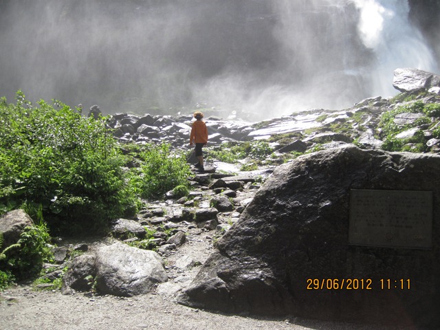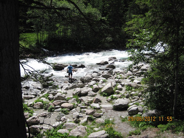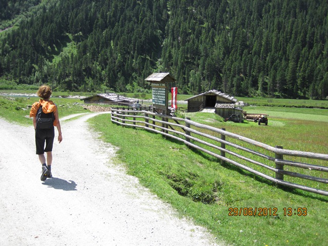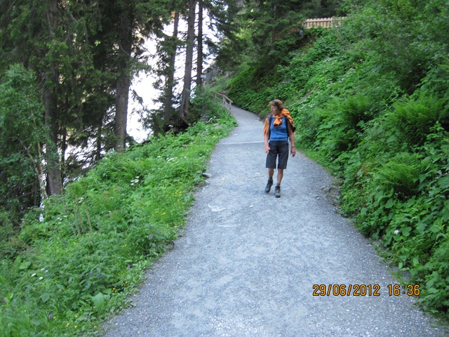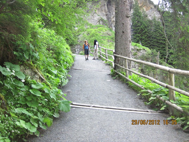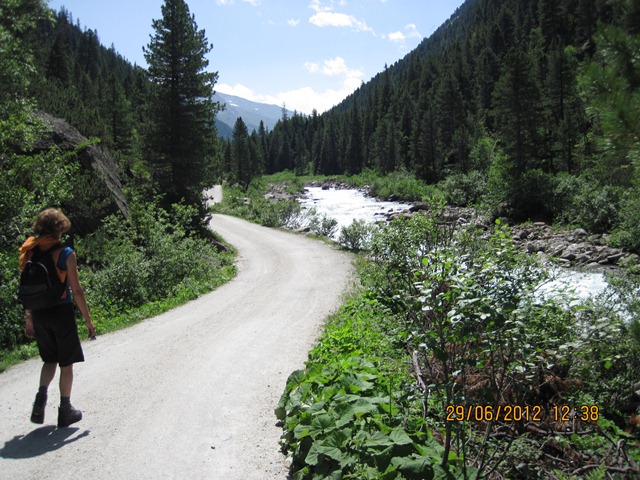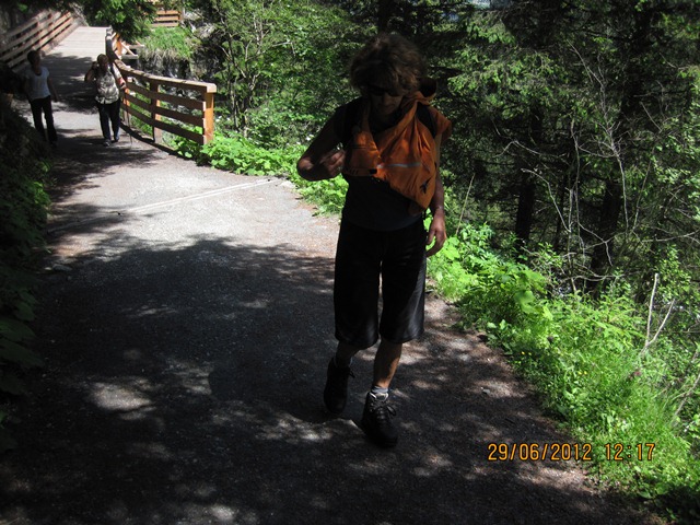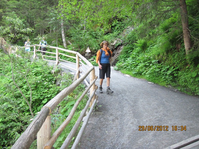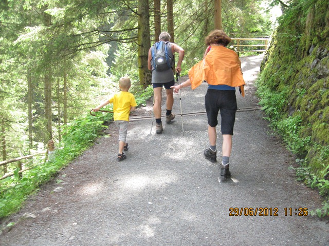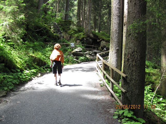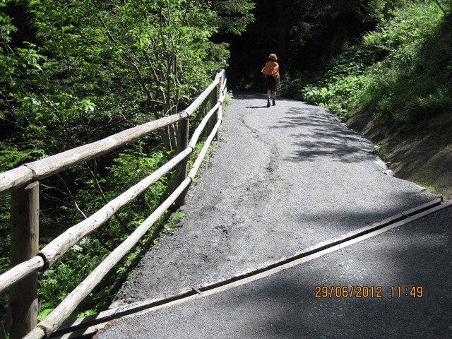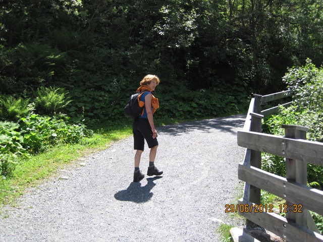 Na het ontbijt trokken Ton en toos hun stoute bergschoenen aan en ginen zij de weg oversteken. Zij liepen het pad parallel aan de weg richting de watervallen.