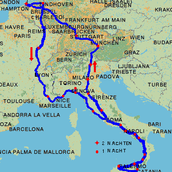 Hij koos eerst via de ANWB routeplanner de route naar Metz. Daarna de route van Metz via Grenoble naar Castellane. Zo ging dat door tot Palermo op Sicilië. Als wij in de nabijheid van de route een mooie of interessante plaats of gebied zouden ontdekken dan zouden wij van de route kunnen afwijken.