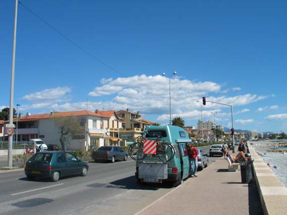 In het begin van de route was het verboden voor campers om langs de boulevard te parkeren maar toen het geoorloofd was om de camper langs de boulevard stil te laten staan, hebben Ton en Toos mij laten uitrusten om zelf van de zon te genieten en om de lunch te nuttigen.