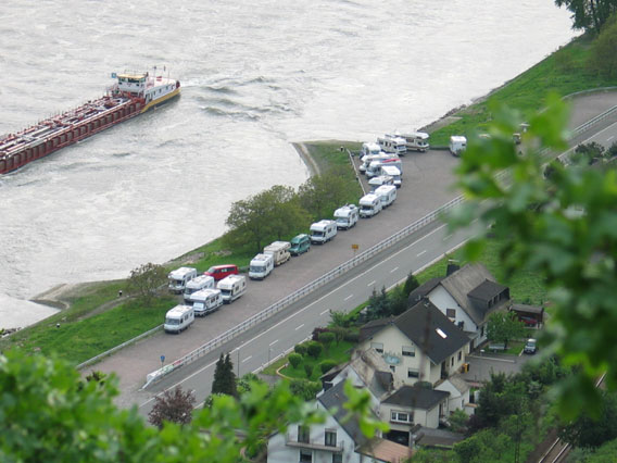 Maar bij de derde gelegenheid stopten wij toch met meer succes. Het was een oude veer oprit bij het dorpje Sankt Goarshausen die gedeeltelijk reeds bezet was door ongeveer tien campers. Omdat het pas drie uur was was het maar half vol bezet want later kwamen er nog veel meer bij, sommigen konden er niet meer staan want het einde van het terrein was sterk hellend en er kon maar een rij campers op het terrein staan.