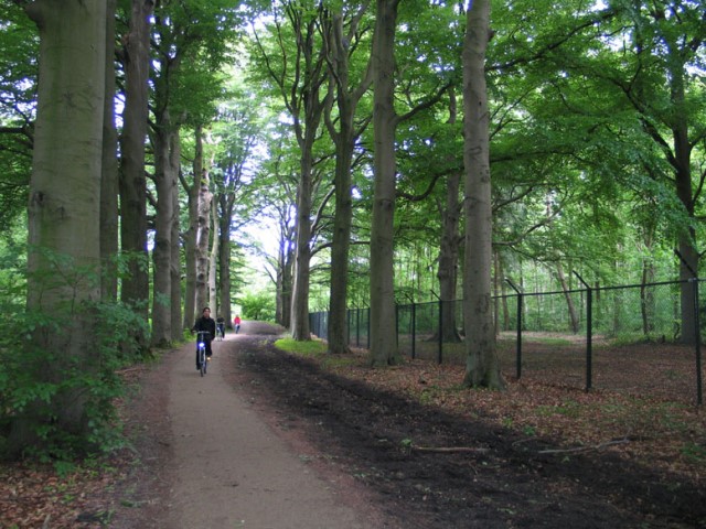 Daarna fietsten ze over de weg tot de splitsing bij het Fazantenhof waar ze omdraaiden en rechtsaf sloegen via het bospad daarna de weg overstaken richting de Hilversumse hei.
