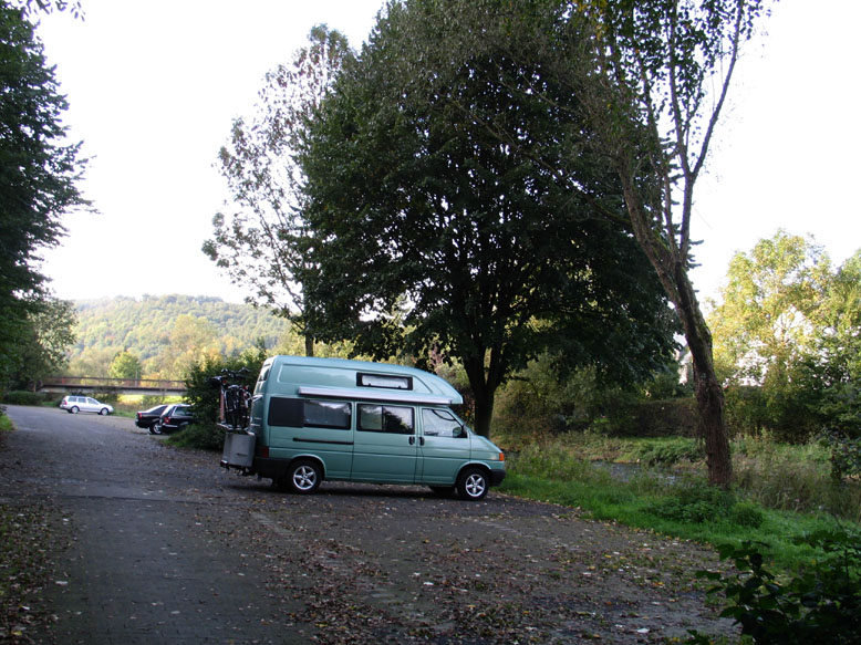 We volgden de borden die naar een camperplaats toe zou leiden en kwamen zodoende op een parkeerplaats langs de Ruhr, net even buiten het centrum, waar in de zomer campers een nacht van 18:30 tot 9:30 uur konden blijven staan voor niets.