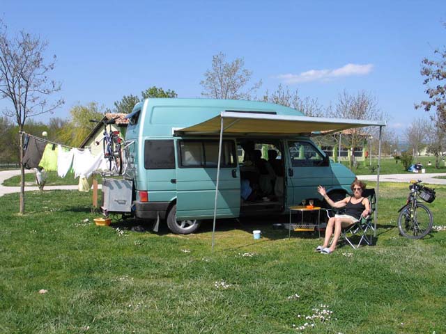 Maar toen wij ons hadden gesetteld moest Tiga eerst nog uitgelaten worden. Dat deed Ton dus en daarbij kwam hij langs een onderkomen van een van de schoonmakers van de camping. Dat stond achter het sanitaire blok, het was niet meer dan een kamertje met een veranda ervoor. En zoals de Spanjaarden het ook al van ons wisten, de schoonmakers komen uit het zuiden, van over de Middellandse Zee dus.