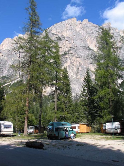 In de ochtend toen Ton en Toos opstonden, was de schaduw van de Monte Cristallo, de berg ten oosten van ons, nog over de camping.