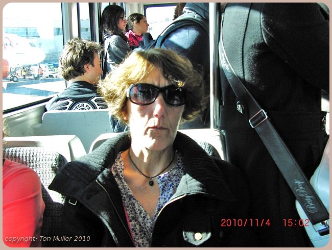 Wij liepen de trap af bij de staart van het vliegtuig en gingen daarna in een gereedstaande bus naar de bagage claim.