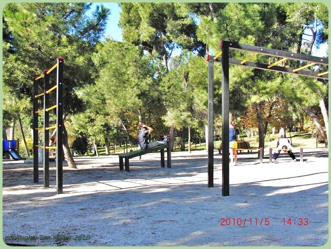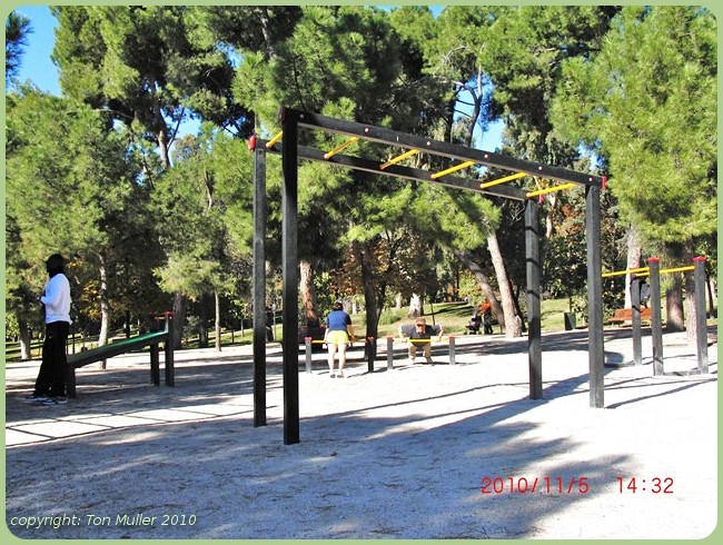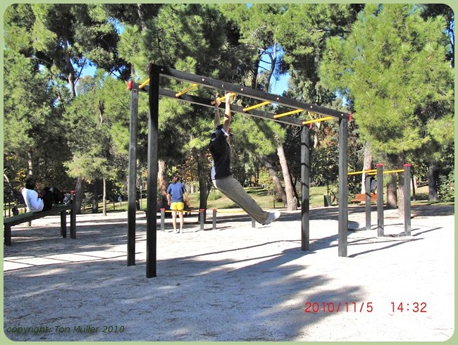Wij kwamen daarna bij een kinder speeltuin annex trimbaan waar ik net als de jonge neger en jonge vrouw aan de rekstok ging hangen en daarna een paar opdrukjes deed,