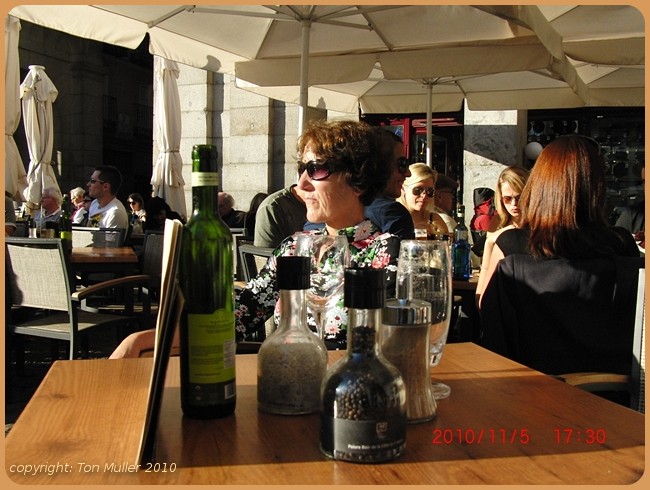 In de middag twee pilsjes en een wijntje gedronken op de Plaza Mayor. Naast twee tafeltjes met Nederlanders.