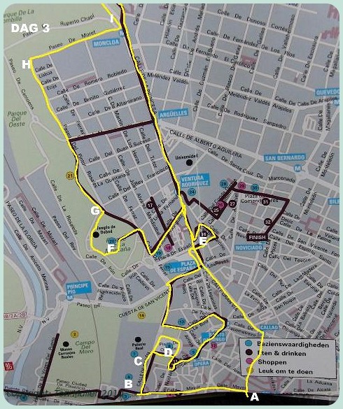 De derde wandeling (geel) van 16 km via de kathedraal, het paleis, het park, de uitkijktoren en de Gran Via